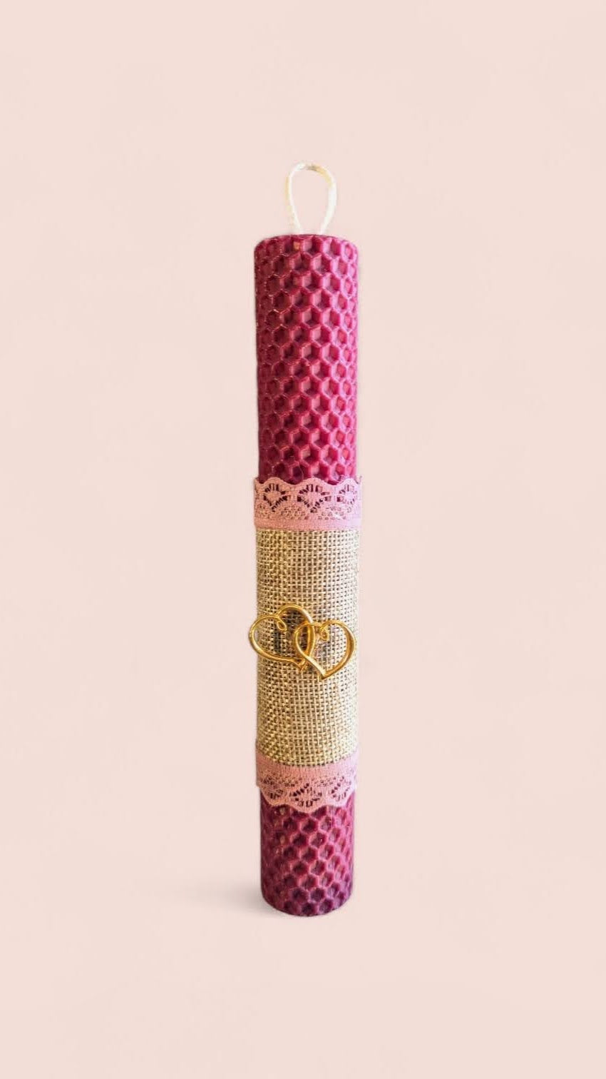 Χειροποίητη, πασχαλινή λαμπάδα από αγνό μελισσοκέρι με μεταλικό κλαδάκι ελιάς.
