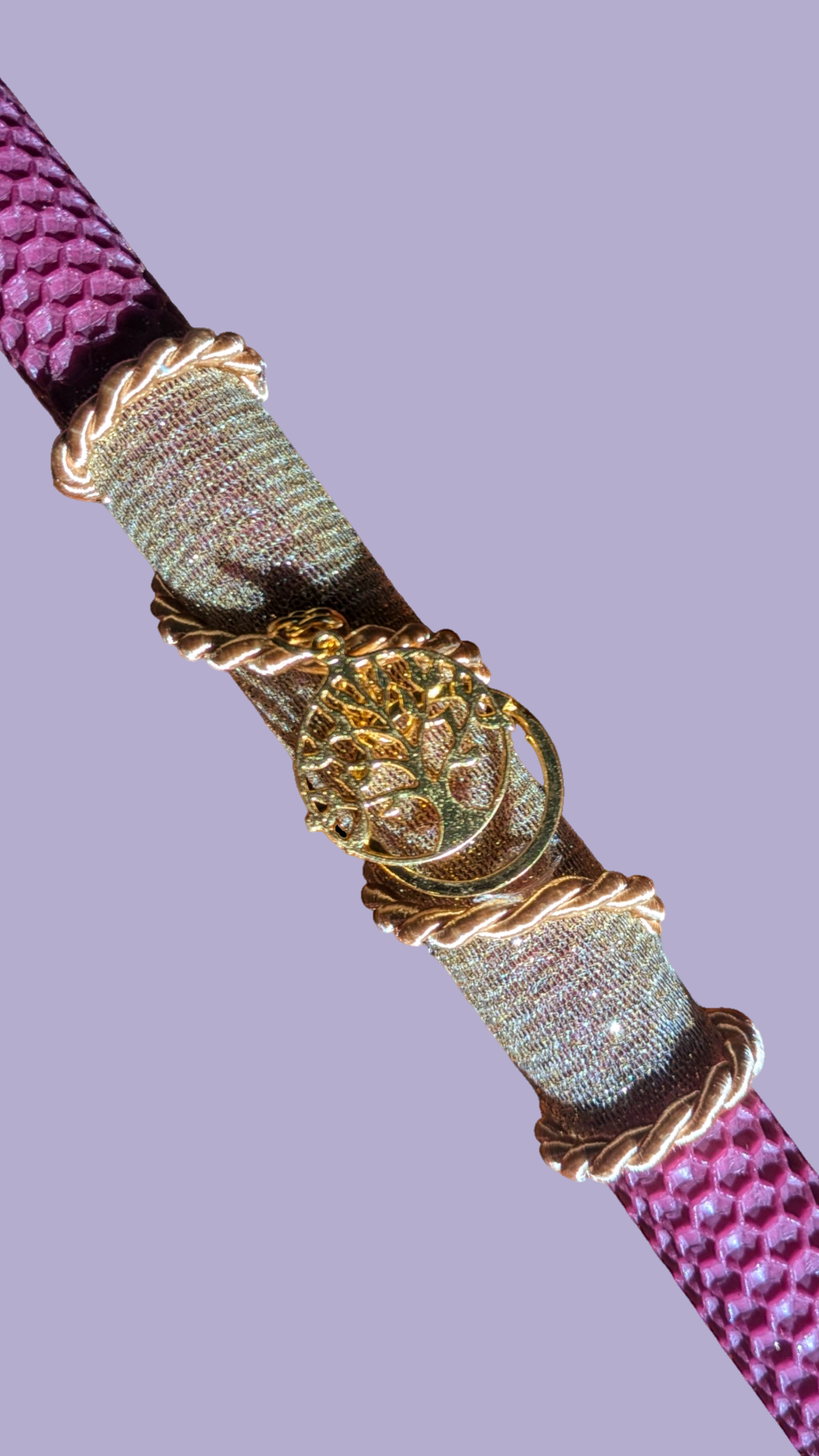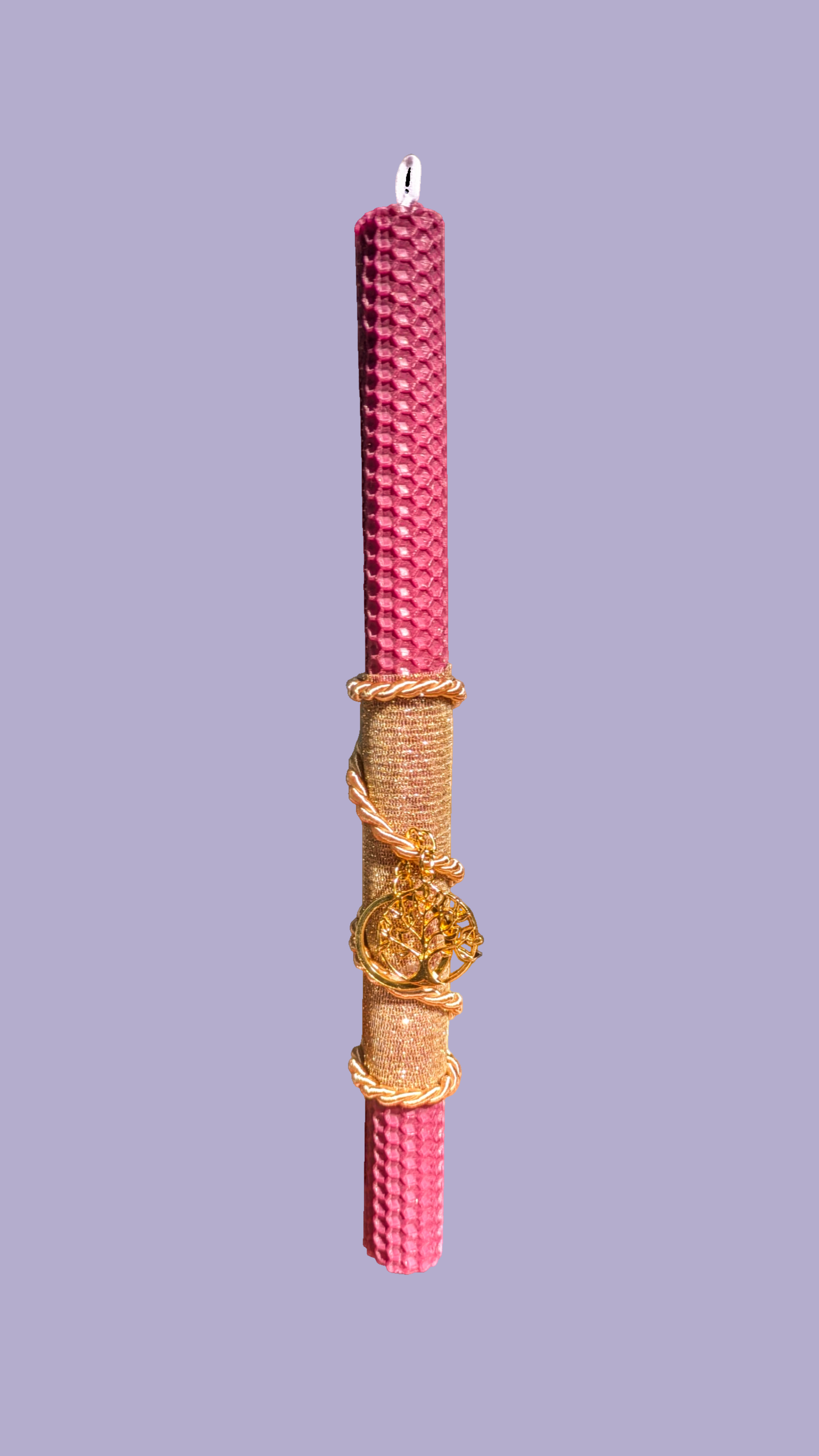 Handgefertigte Osterkerze aus reinem Bienenwachs mit einem Schlüsselanhänger aus Metall in Form eines Lebensbaums.
